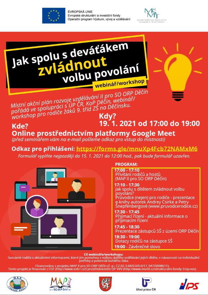 Vážení RODIČE letošních deváťáků ZŠ ve spolupráci s Mgr. Michaelou Houdovou, vedoucí Oddělení poradenství a dalšího vzdělávání - Kontaktní pracoviště ÚP ČR v Děčíně a dále s lektorkou a kariérovou poradkyní Andreou Csirke, spoluautorkou knihy "Jak spolu s dítětem zvládnout volbu povolání", jsme pro vás připravili on line webinář, ve které se dozvíte aktuální informace k volbě dalšího vzdělávání vašich deváťáků v návaznosti na idividuální potřeby a potenciál vašeho dítěte.
