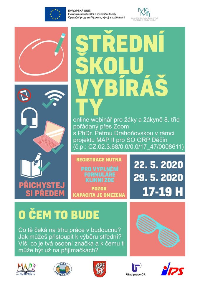 Ve spolupráci s Mgr. Houdovou, vedoucí Oddělení poradenství a dalšího vzdělávání - Kontaktní pracoviště ÚP ČR v Děčíně a s lektorkou a kariérovou poradkyní PhDr. Drahoňovskou jsme připravili online seminář pro žáky 8. tříd základních škol z území SO ORP Děčín. Jedním z hlavních cílů projektu MAP II pro SO ORP Děčín je právě rozvoj kvalitního kariérového poradenství na základních školách a jeho podpora.