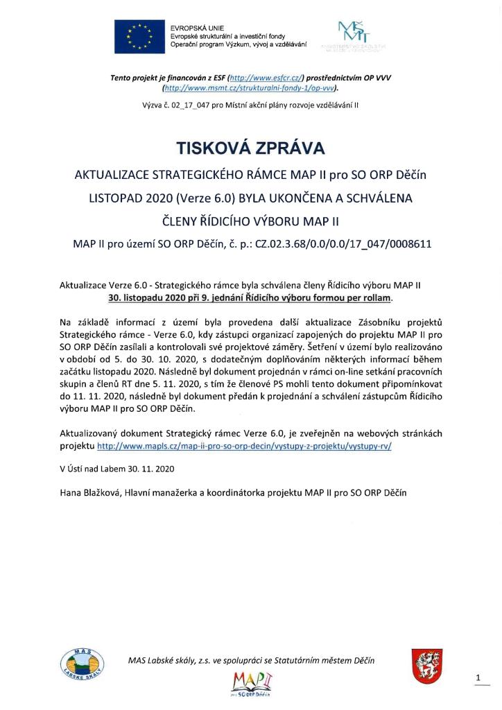 Aktualizace dokumentu Strategický rámec Verze 6.0 byla schválena členy Řídicího výboru MAP II 30. listopadu 2020 při 9. jednání Řídicího výboru formou per rollam.