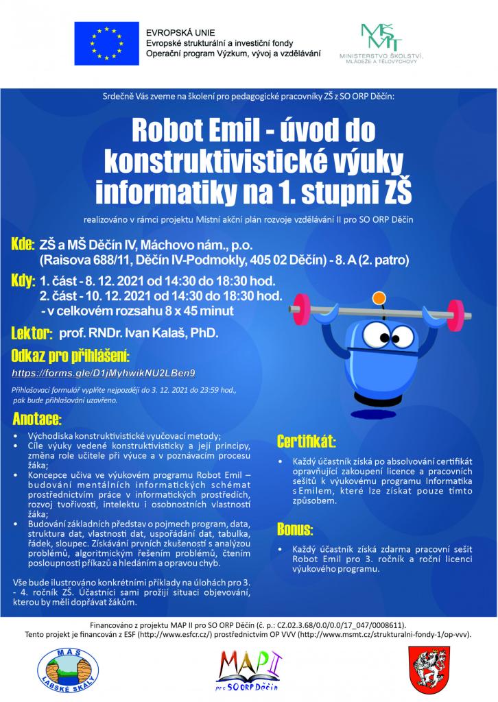 na základě posledních jednání členů pracovních skupin a především ve spolupráci s Mgr. Martinem Lánou (Odborník/místní lídr pro oblast podpory digitálních kompetencí a začleňování ICT do procesu vzdělávání, Lídr z území ORP DC do KAP) Vás srdečně zveme na školení "Robot Emil - úvod do konstruktivistické výuky informatiky na 1. stupni ZŠ", které pro Vás pořádáme v rámci projektu MAP II pro SO ORP Děčín.
