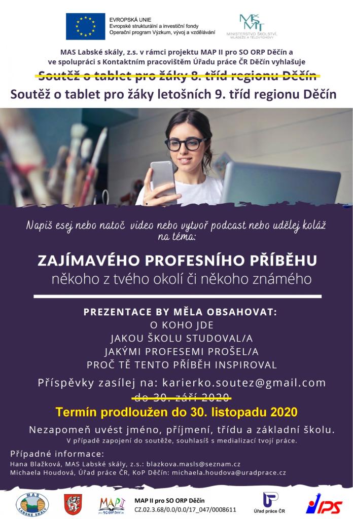 V rámci projektu MAP II pro SO ORP Děčín a ve spolupráci s Kontaktním pracovištěm Úřadu práce ČR Děčín vyhlašuje Soutěž o tablet pro žáky loňských 8. tříd (školní rok 2019/2020) z regionu Děčín: