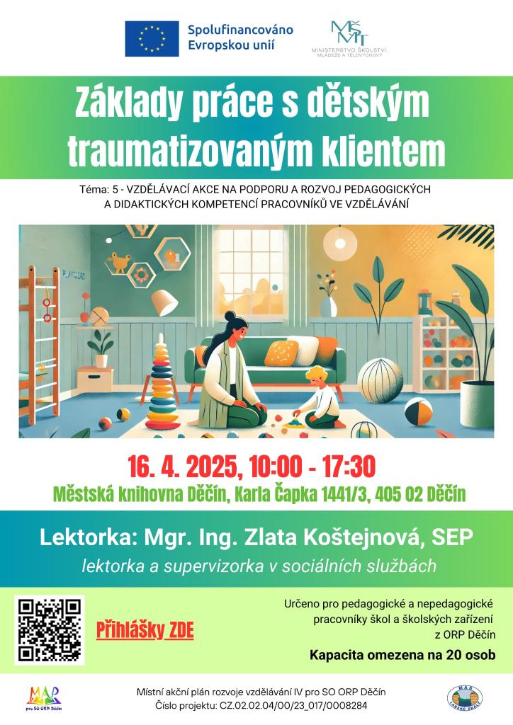 srdečně Vás zveme na prezenční seminář "Základy práce s dětským traumatizovaným klientem", který bude realizován v rámci projektu MAP IV pro SO ORP Děčín. Seminář proběhne 16. dubna 2025 od 10:00 do 17:30 hod. prezenční formou v prostorách Městské knihovny Děčín.