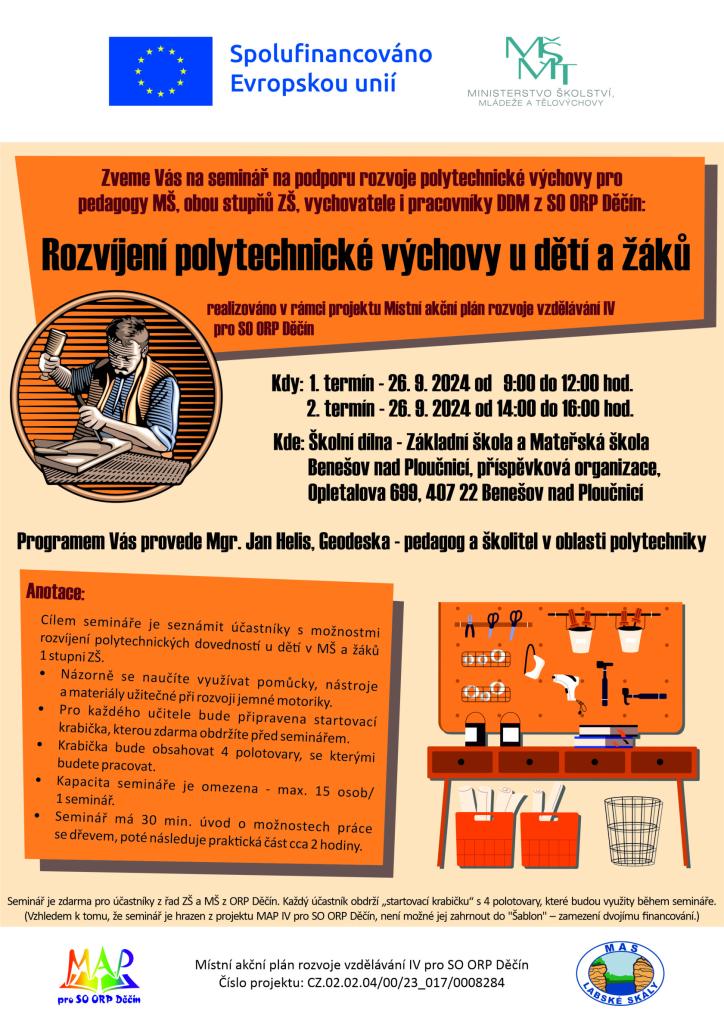 Dne 26. 9. 2024 proběhl úspěšný seminář na podporu rozvoje polytechnické výchovy, který byl určen pro pedagogy mateřských škol, obou stupňů základních škol, vychovatele a pracovníky DDM z SO ORP Děčín. Seminář vedl Mgr. Jan Helis a konal se v prostorách ZŠ a MŠ Benešov nad Ploučnicí. Akce se setkala s velkým ohlasem, účastníci měli možnost vyzkoušet si praktické využití nástrojů a pomůcek pro rozvoj jemné motoriky a obdrželi dřevěné polotovary, které si sami pak opracovali a sestavil krásné předměty. Seminář byl realizován moderní didaktickou formou, což ocenili všichni přítomní zástupci škol.